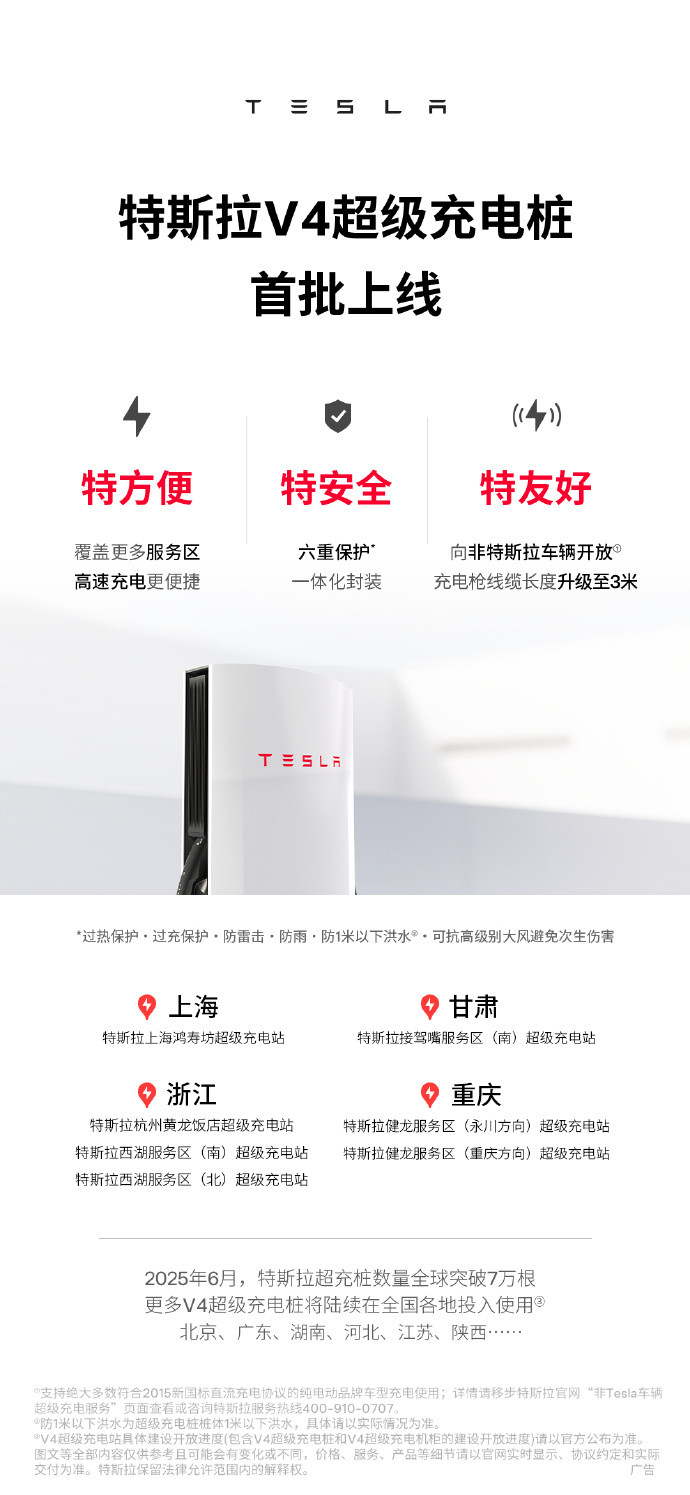 今日特斯拉宣布特斯拉V4超级充电桩首批上线,覆盖更多服务区,防雨防水等六重强悍保护,同步向非特斯拉车辆开放,其他品牌车辆也能充。